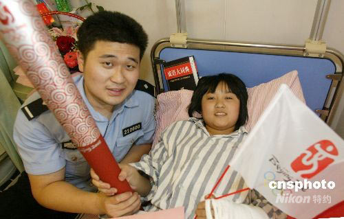 田野,是南京市公安局華僑路派出所的一名民警,也是北京奧運會的火炬手。5月29日,他和他的同事帶著奧運火炬來到江蘇省人民醫(yī)院愛心病房,看望6位在四川地震中受災的孩子,讓他們近距離的看到了“祥云”火炬,并告訴他們在火炬?zhèn)鬟f中大家對災區(qū)的祝愿。中新社發(fā) 吳俊 攝