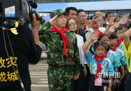 5月30日,航天英雄楊利偉來(lái)到總裝備部綿陽(yáng)八一帳篷學(xué)校,與孩子們一起歡度六一兒童節(jié)。圖為楊利偉和小學(xué)生們向國(guó)旗敬禮。秦憲安 攝