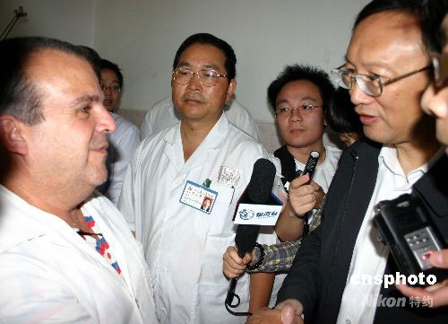 5月30日上午,中國外交部部長楊潔篪來到四川省人民醫(yī)院,看望在這里救治地震災區(qū)傷病員的古巴醫(yī)療隊,感謝他們給予四川地震災區(qū)民眾的關心,并高度贊揚了他們的國際人道主義精神。中新社發(fā) 楊杰 攝