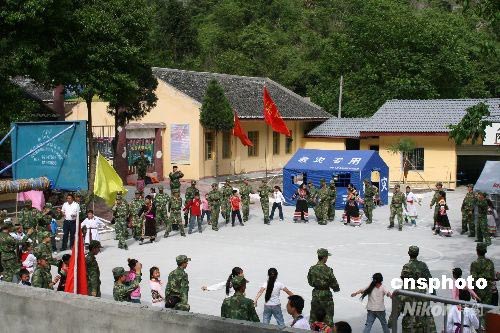 四川震區(qū)藏族小學(xué)生與救災(zāi)解放軍共跳“團(tuán)結(jié)舞”