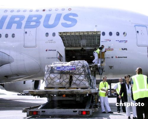 巴黎時間5月30日下午,由中國駐法國大使館組織的第二批救災帳篷從巴黎戴高樂機場啟運四川地震災區(qū),這批帳篷共1105頂,價值25萬多歐元。帳篷的募集得到了法國僑界、法國企業(yè)界的大力支持,由空客提供巨無霸A380飛機運送。另外,中國駐法使館和僑界組織的第三批救災帳篷1000頂將于30日夜里啟運四川。中新社發(fā) 吳衛(wèi)中 攝