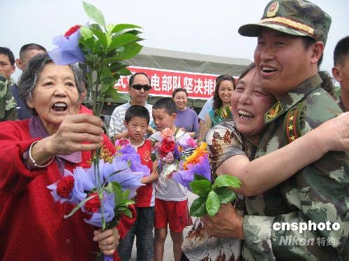 6月1日,許多綿陽市民自發(fā)前往南郊機(jī)場歡迎參加唐家山堰塞湖搶險的武警官兵,并為他們獻(xiàn)花、送水。從5月31日起,參加唐家山堰塞湖搶險的武警官兵陸續(xù)乘機(jī)返回綿陽市。中新社發(fā) 肖青 攝