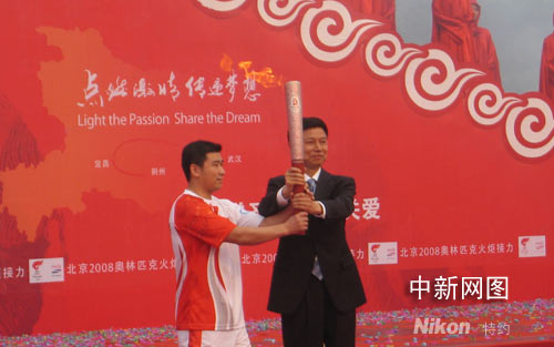 六月二日上午八時十二分,北京奧運會火炬接力荊州傳遞開始,該市傳遞路線全長為十八點八公里。圖為體操奧運冠軍鄭李輝從中共荊州市委書記應(yīng)代明手中接過火炬開始第一棒傳遞。 中新社發(fā) 艾啟平 攝