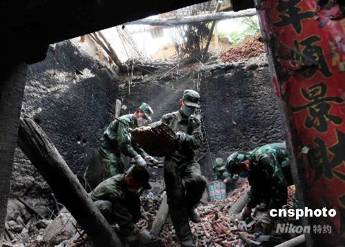 6月2日,進村入戶參加抗震救災的鐵軍官兵在海拔2000多米高的汶川縣威州鎮(zhèn)布瓦村村民王健華家清理在地震中倒塌的房屋。中新社發(fā) 曾憲平 攝