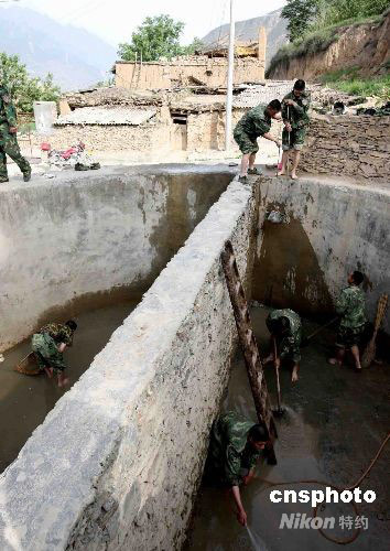 6月2日,參加抗震救災(zāi)的鐵軍官兵在海拔2000多米高的汶川威州鎮(zhèn)布瓦村幫助災(zāi)民清理儲(chǔ)水井。中新社發(fā) 曾憲平 攝