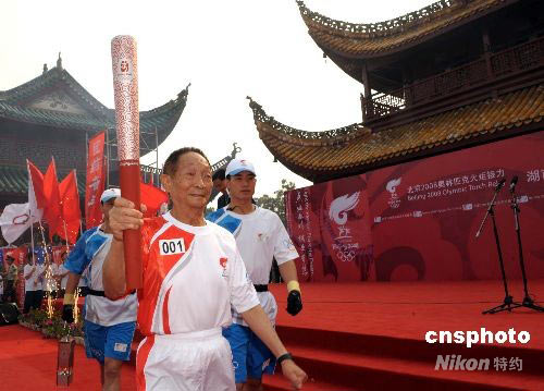 6月3日,奧運圣火開始在湖南岳陽傳遞,中國雜交水稻之父袁隆平在岳陽樓前傳遞湖南第一棒火炬。 中新社發(fā) 廖攀 攝
