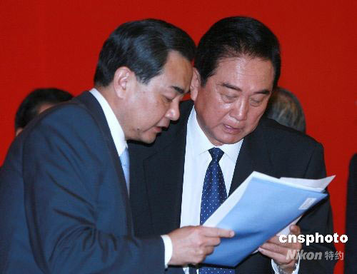 6月3日,海峽兩岸關(guān)系協(xié)會第二屆理事會第一次會議在北京人民大會堂舉行,王毅、陳云林出席會議。圖為新任國務(wù)院臺灣事務(wù)辦公室主任王毅與原國務(wù)院臺灣事務(wù)辦公室主任陳云林在會議上交談。中新社發(fā) 廖文靜 攝