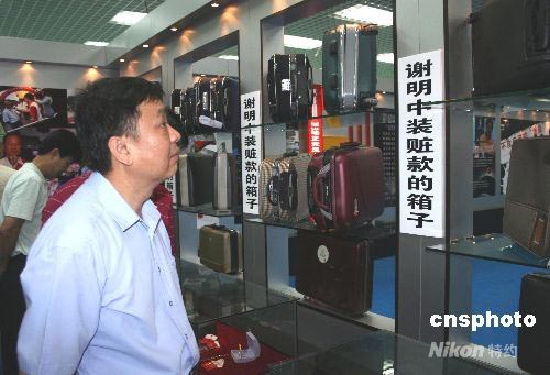 六月三日,?陂_幕的2008海南反腐倡廉警示教育展覽,展出原海南省委委員、文昌市委書記謝明中裝贓款的十八只箱子,以及價值四十萬元人民幣的滿天星手表等贓物。謝明中在擔任文昌市委書記期間,利用職權,在工程審批、資金安排、干部提拔等方面為他人謀取利益,大量收受或索取賄賂,還與多名女性發(fā)生不正當男女關系。海南省紀委共查獲謝明中轉(zhuǎn)移或藏匿的賬款折合人民幣兩千五百余萬元,另有金銀首飾等物品十七件。中新社發(fā) 關向東 攝