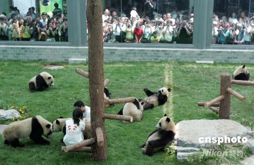 八只臥龍“奧運(yùn)大熊貓寶寶”在北京動(dòng)物園的新家中以迥然不同的姿勢(shì)接受爆滿的觀眾“檢閱”。中新社發(fā) 任晨鳴 攝