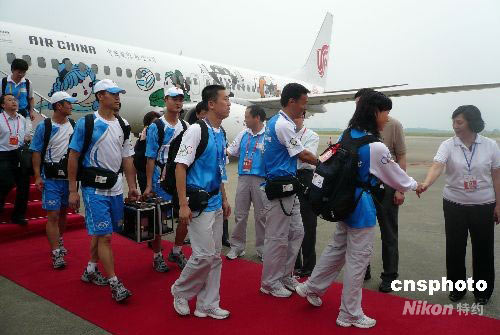 六月五日下午十七時(shí)四十五分,承載北京奧運(yùn)會(huì)圣火火種的中國(guó)國(guó)航圣火號(hào)專(zhuān)機(jī),平安抵達(dá)國(guó)際旅游名城廣西桂林,奧運(yùn)圣火正式開(kāi)始在廣西這個(gè)少數(shù)民族自治區(qū)的傳遞活動(dòng)。六月六日、七日、八日,奧運(yùn)圣火將分別在廣西桂林、南寧、百色傳遞。中新社發(fā) 周利朔 攝