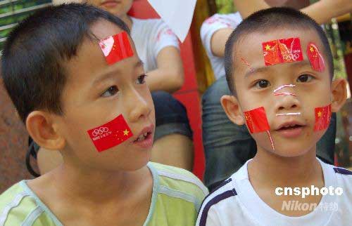 兩名臉上貼著國旗圖案的少年在迎接奧運(yùn)圣火的到來。中新社發(fā) 劉萬強(qiáng) 攝