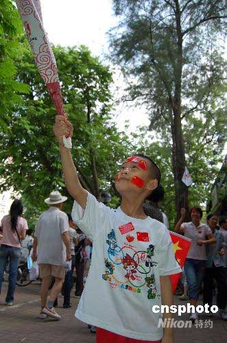 一名少年高舉自制奧運“祥云”火炬喜迎圣火。中新社發(fā) 劉萬強 攝