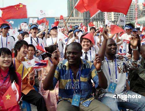 來(lái)自越南、老撾、泰國(guó)等國(guó)的留學(xué)生與當(dāng)?shù)孛癖娨黄鸸灿セ,為中?guó)加油。中新社發(fā) 黃艷梅 攝