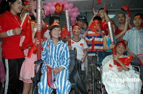 傳遞結束后,五名火炬手趕到廣西醫(yī)科大學附屬醫(yī)院,看望在這里治療的四川地震災區(qū)傷員,并讓他們與“祥云”親密接觸,了卻看奧運圣火傳遞的心愿。中新社發(fā) 蔣雪林 攝
