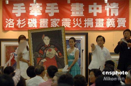 當(dāng)?shù)貢r(shí)間六月七日下午,洛杉磯地區(qū)旅美畫家賑災(zāi)捐畫義賣活動(dòng)在阿罕布拉市舉行,近百名旅美畫家為中國(guó)地震災(zāi)區(qū)捐獻(xiàn)了數(shù)百幅作品,當(dāng)?shù)財(cái)?shù)百名藝術(shù)品收藏家和愛(ài)好者參加了義賣活動(dòng)。最終,百分之九十以上的畫作被成功拍賣,總成交約二十萬(wàn)美元。中新社發(fā) 張煒 攝