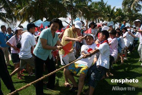 六月八日端午節(jié),八十九位四川地震失親兒童在海南參加“心靈呵護 陽光之旅”已經(jīng)一周,端午節(jié)當日孩子們在三亞山海天大酒店參加拔河比賽。中新社發(fā) 關向東 攝