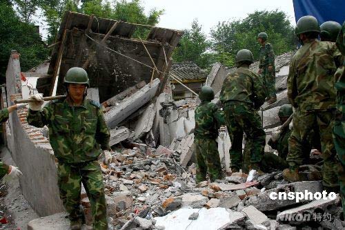 6月8日,中國空降兵某部“常勝模范連”所在團官兵,進村入戶之后,在四川省什邡市鎣華鎮(zhèn)幫助受災(zāi)群眾清理廢墟,搭建臨時過渡房。中新社發(fā) 譚超 攝