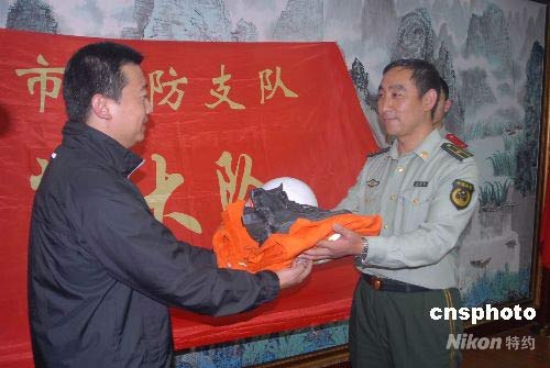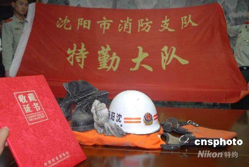 6月9日,中國國家博物館在沈陽消防支隊舉行了抗震救災(zāi)相關(guān)實物和資料收藏的交接儀式,四川抗震救災(zāi)中沈陽消防支隊特勤大隊隊旗、大隊長李忠海的防護(hù)服(含頭盔)和隊員的戰(zhàn)地日記等成為了中國國家博物館永久性收藏品。這是中國國家博物館首次收藏四川抗震救災(zāi)實物和資料。在四川抗震救災(zāi)中,沈陽市消防局特勤大隊是中國第一支進(jìn)入北川縣的救援隊。中新社發(fā) 沈警 攝