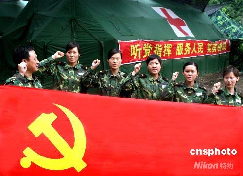 6月9日,濟(jì)南軍區(qū)第159醫(yī)院赴平武野戰(zhàn)醫(yī)療隊(duì)黨支部為5名在抗震救災(zāi)中表現(xiàn)出色的“80后”女隊(duì)員舉行了入黨宣誓儀式。 中新社發(fā) 畢華明 攝