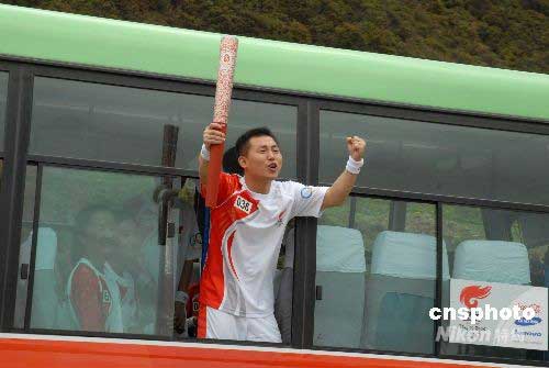 一位火炬手結(jié)束傳遞活動前往結(jié)束儀式途中,手舉祥云火炬,高喊“中國加油”。中新社發(fā) 石雨 攝