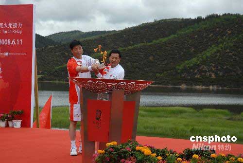 6月11日11時(shí),奧運(yùn)圣火香格里拉傳遞的最后一棒由香格里拉縣委書記彭耀文(左)和中國著名長跑運(yùn)動員張國偉共同完成,祥云圣火在普達(dá)措國家公園完成香格里拉最后的傳遞線路。隨后兩名火炬手在屬都湖邊點(diǎn)燃圣火盆,奧運(yùn)圣火傳遞香格里拉站圓滿結(jié)束。