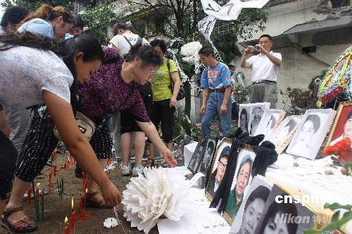 6月12日,四川大地震重災(zāi)區(qū)都江堰市都煤家屬院民眾自發(fā)為地震中遇難的16位親友舉行祭奠活動(dòng)。中新社發(fā) 劉新 攝
