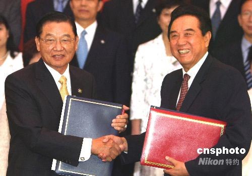 6月13日上午,海峽兩岸關(guān)系協(xié)會(huì)會(huì)長(zhǎng)陳云林與臺(tái)灣海峽交流基金會(huì)董事長(zhǎng)江丙坤在北京釣魚(yú)臺(tái)五號(hào)樓簽署“兩岸周末包機(jī)”和“大陸居民赴臺(tái)旅游”協(xié)議。中新社發(fā) 任晨鳴 攝