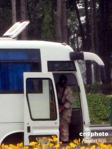 圖為演習(xí)過(guò)程中,“恐怖分子”在劫持的班車(chē)上望風(fēng)。 中新社發(fā) 未然 攝