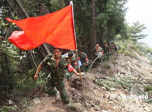 6月13日,四川省三個(gè)軍分區(qū)的一千多名預(yù)備役官兵繼續(xù)從映秀鎮(zhèn)緊急趕赴失事直升機(jī)警民遺體營地,他們將運(yùn)送全部失事直升機(jī)遇難者遺體下山。中新社發(fā) 賈國榮 攝