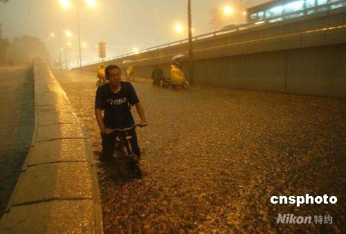 6月13日下午5時許,強雷陣雨突襲京城,北京市氣象臺發(fā)布了雷電黃色預(yù)警信號。 圖為在北京一橋下積水路段,民眾“河”中推車。中新社發(fā) 富田 攝
