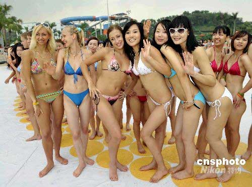 6月15日,充滿了東方魅力的1500名比基尼女郎在廣州長隆水上樂園挑戰(zhàn)2007年在澳大利亞黃金海岸的1010位比基尼女郎合照紀(jì)錄。1500名比基尼女郎齊心協(xié)力通過集體的行為藝術(shù),擺出大型的奧運五環(huán)造型,用自己的力量支持北京奧運!中新社發(fā) 劉衛(wèi)勇 攝