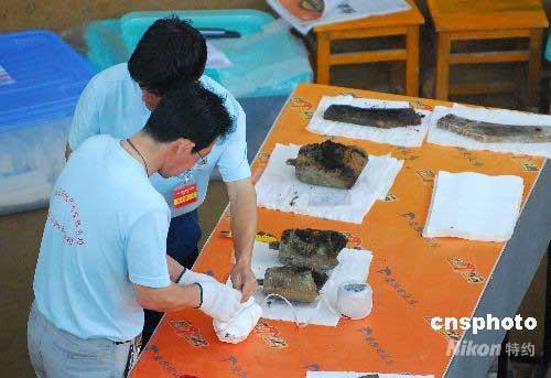 考古人員在對(duì)提取上來的青銅器進(jìn)行簡(jiǎn)單處理。中新社發(fā) 從啟 攝