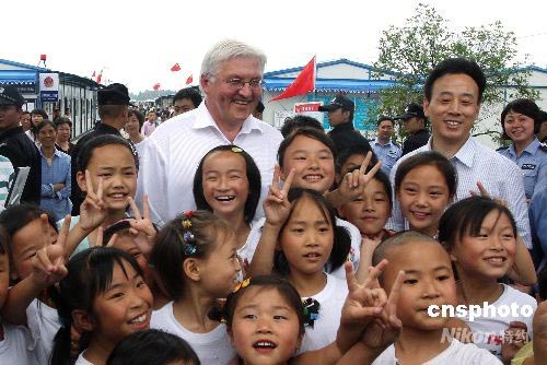 德國副總理兼外長施泰因邁爾來到四川地震災(zāi)區(qū)都江堰市“勤儉人家”安置點,看望安置點的居民和帳篷學(xué)校的孩子們。圖為施泰因邁爾和孩子們合影留念。中新社發(fā) 黃榮 攝