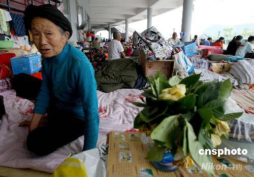一位八十歲老太太身旁,好心人送的一束清香梔子花。中新社發(fā) 賈國(guó)榮 攝