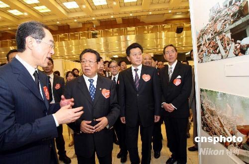 圖為香港署理行政長官唐英年(左)、中聯(lián)辦副主任李剛(右二)、大公報社長王國華(左二)等在主持開幕式后觀看圖片展。