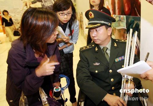 “大愛無疆—汶川大地震抗震救災(zāi)圖片展”在香港展覽中心展出,大會(huì)邀請(qǐng)到抗震救災(zāi)第一線的英雄成都軍區(qū)的鐘良軍在開幕式上作報(bào)告。中新社發(fā) 洪少葵 攝