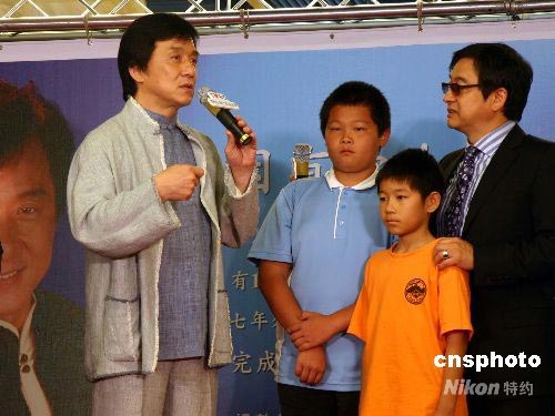 6月18日,應TVBS關(guān)懷臺灣文教基金會邀請,成龍出席“寶貝我們的希望——成龍代言募款記者會”。圖為成龍與來自臺東、云林、臺北等縣的貧苦學童面對面溝通。中新社發(fā) 許曉青 攝