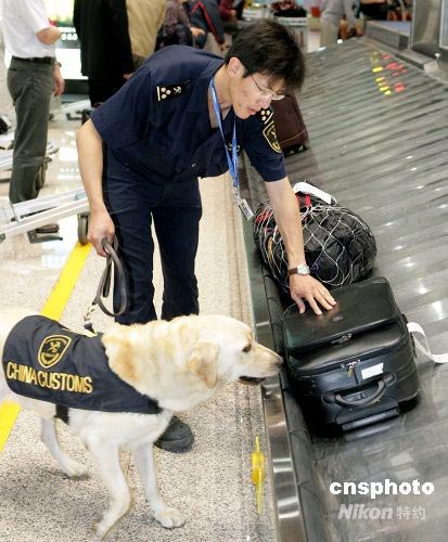 北京海關(guān)旅檢、緝私部門等近日在首都機場聯(lián)合進行奧運安保綜合演練,考察一線關(guān)員處置突發(fā)事件的應(yīng)變能力。圖為搜爆犬在機場行李中查緝爆炸物品。 中新社發(fā) 雷虹 攝