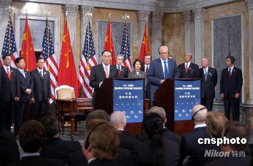 當(dāng)?shù)貢r(shí)間6月18日下午,剛剛結(jié)束中美第四次戰(zhàn)略經(jīng)濟(jì)對(duì)話的中國(guó)副總理王岐山和美國(guó)財(cái)政部長(zhǎng)保爾森,在華盛頓共同會(huì)見(jiàn)記者。隨后雙方簽署《中美能源環(huán)境十年合作框架》文件。中新社發(fā) 管黎明 攝