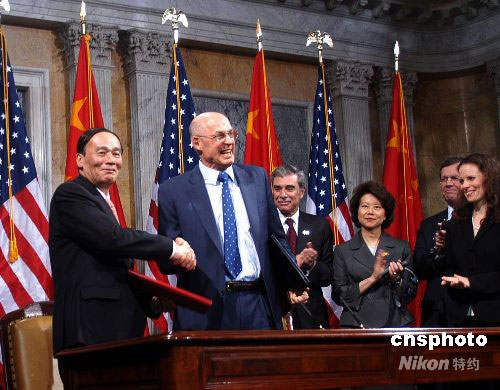 當(dāng)?shù)貢r(shí)間6月18日,中美在華盛頓簽署《中美能源環(huán)境十年合作框架》文件。圖為中國(guó)副總理王岐山和美國(guó)財(cái)政部長(zhǎng)保爾森在簽字儀式上。中新社發(fā) 管黎明 攝