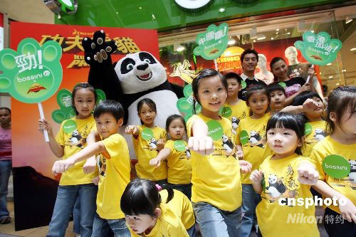 六月十九日,香港一服飾連鎖店推出動畫電影《功夫熊貓》服飾系列,一群穿著功夫服飾的小朋友與功夫熊貓“阿寶”登場造勢。中新社發(fā) 洪少葵 攝