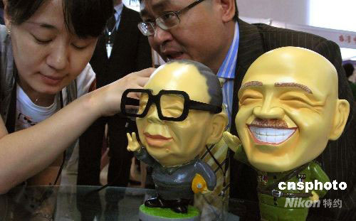 6月19日,“2008北京國(guó)際旅游博覽會(huì)”在北京展覽館開(kāi)幕,臺(tái)灣桃園縣與民間觀光旅游團(tuán)展臺(tái)引人注目。圖為臺(tái)灣桃園觀光產(chǎn)業(yè)促進(jìn)會(huì)副召集人、桃園縣觀光行銷(xiāo)處處長(zhǎng)陳國(guó)君(右),邊展示“兩蔣Q版公仔”,邊向北京媒體推介桃園縣旅游。中新社發(fā) 鄒憲 攝