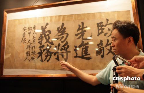 預(yù)展中,一幅紙質(zhì)黃舊的書法作品——“臨敵先進,為將義務(wù)”吸引眾人的眼球,這是當年刺殺伊藤博文的韓國民族英雄安重根在獄中的絕筆書。圖為工作人員講解這幅書法作品的歷史價值。中新社發(fā) 趙雋 攝