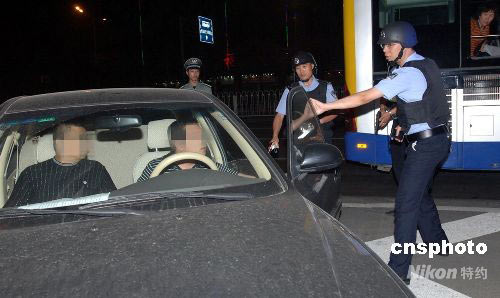 六月十九日夜,北京豐臺警方舉行奧運安保演練,進行設(shè)卡攔截演習。五十余輛警車迅速到達進出北京方向和相關(guān)環(huán)線的各個路口執(zhí)行攔截任務(wù),并成功將“犯罪嫌疑人”截獲。中新社發(fā) 楊陽 攝