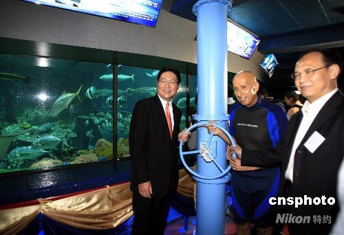 香港特區(qū)商務(wù)及經(jīng)濟發(fā)展局局長馬時亨(左)、全國水生野生動物保護分會會長李彥亮(右)、海洋公園主席盛智文在海洋公園海洋館為中華鱘新居揭幕。中新社發(fā) 王麗南 攝