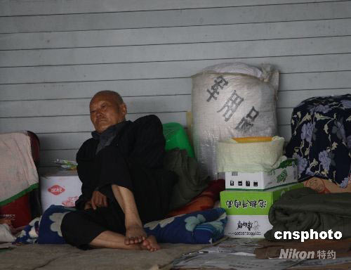 北川縣一位家園被毀的老人倚靠在地鋪上陷入沉思。中新社發(fā) 賈國榮 攝
