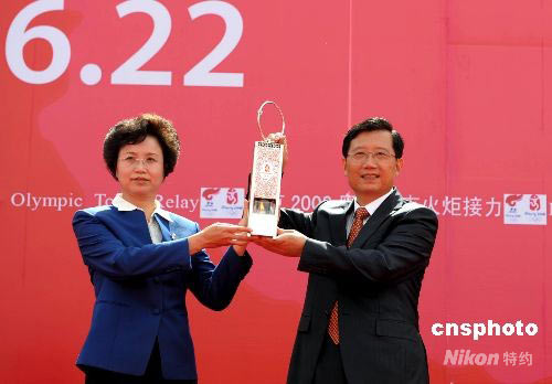 6月22日,在奧運圣火青海格爾木傳遞結(jié)束儀式上,中共青海省委書記強衛(wèi)(右)和青海省省長宋秀巖(左)共同展示奧運圣火火種燈。中新社發(fā) 廖攀 攝