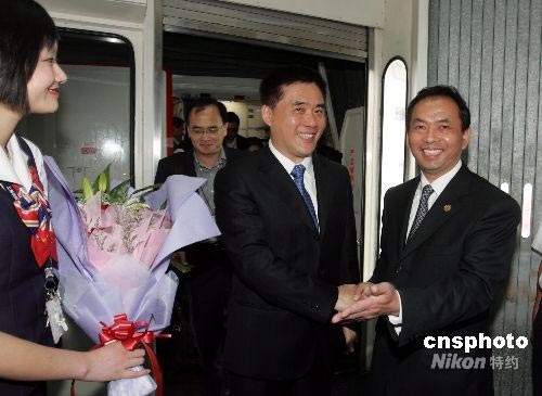 6月23日下午,臺(tái)北市長(zhǎng)郝龍斌抵達(dá)上海浦東國(guó)際機(jī)場(chǎng),開始對(duì)上海進(jìn)行為期5天的訪問,這是新中國(guó)成立以來,臺(tái)北市長(zhǎng)首次訪問上海。圖為上海市臺(tái)辦主任楊建榮(右)到機(jī)場(chǎng)迎接。中新社發(fā) 潘索菲 攝