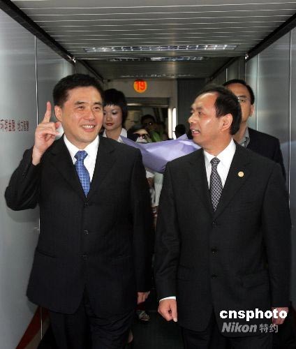 圖為郝龍斌(左)與上海市臺辦主任楊建榮(右)在機(jī)場談笑甚歡。中新社發(fā) 潘索菲 攝