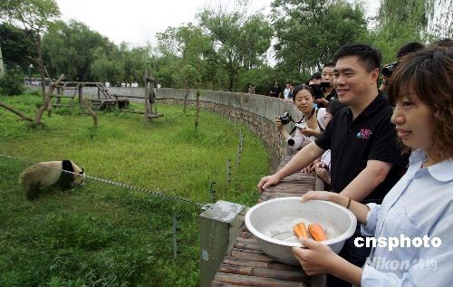 6月25日上午,臺(tái)北市長(zhǎng)郝龍斌一行到上海野生動(dòng)物園,看望大熊貓。中新社發(fā) 潘索菲 攝